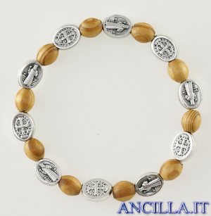 Bracciale elastico (diametro 6 cm) con grani ovali in legno imitazione ulivo intervallati da pater raffiguranti San Benedetto e relativa croce a tergo in rame argentato.