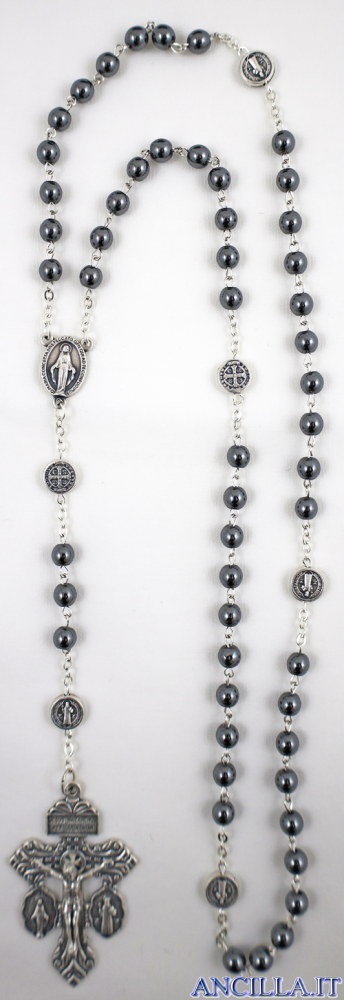 Corona del Rosario con grani in ematite grigio scuro dal diametro di 6 mm, con medaglia di San Benedetto ogni Pater e croce del Perdono.