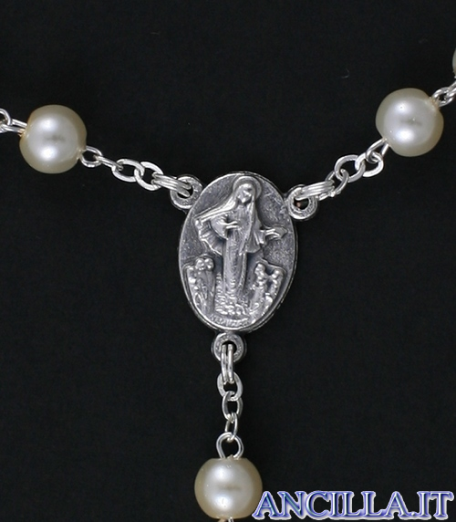 Corona del Rosario in ottone argentato con grani in perla di vetro cerato per recitare i 7 Pater/Ave/Gloria come la Madonna ha chiesto ai veggenti di Medjugorje.