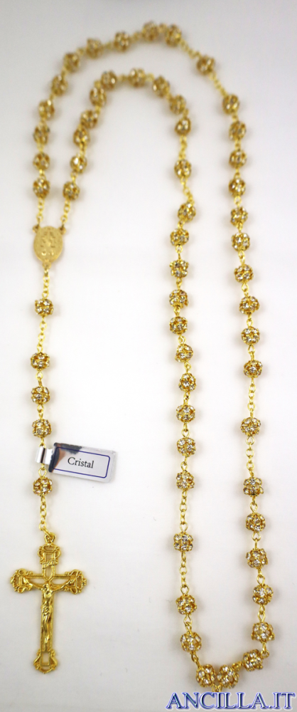 Corona del Rosario con grano in cristalli a intarsio Swarosky da 8 mm. Elegante e raffinata con la luminosità degli Swarowsky e il metallo dorato.