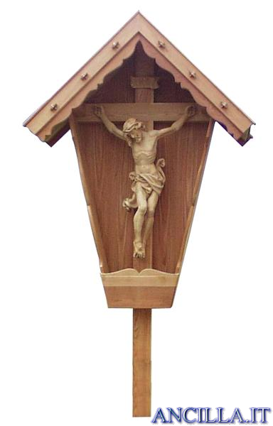 Croce da giardino con capitello in legno di larice brunito scolpita, lavorata e rifinita con perfetta cura del particolare da una ditta specializzata della Val Gardena.