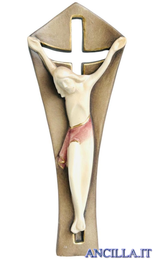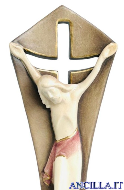 Crocifisso "Figlio del Padre" realizzato in legno di frassino dipinto con colori a olio tinte pastello.