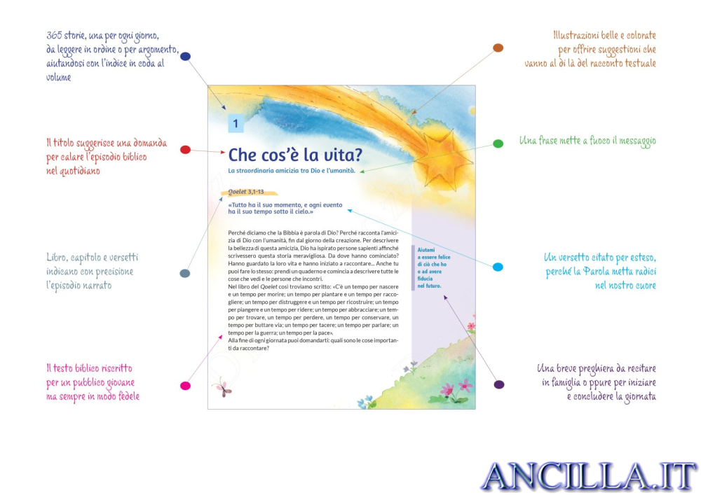 Ogni storia è anticipata da una domanda che tocca la vita di ogni giorno, rendendo il testo biblico attuale e concreto, ed è accompagnata da una breve preghiera che può essere usata come punto di partenza per una riflessione in famiglia, oppure per iniziare o concludere la giornata.