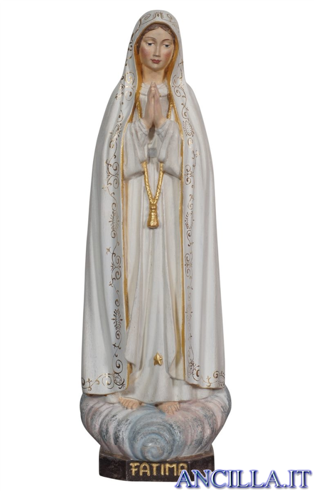 Statua in legno "Madonna di Fatima Capelinha" dipinta con colori a olio, rifinitura antica con oro zecchino.