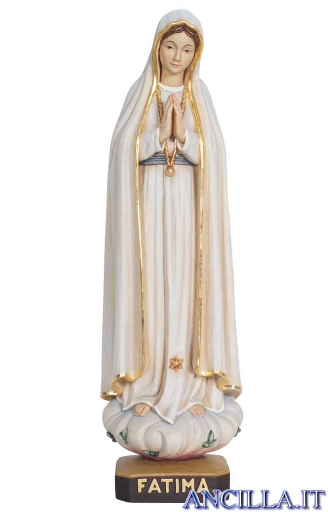 Statua della Madonna di Fatima dipinta con colori a olio e dorata con foglia d'oro.