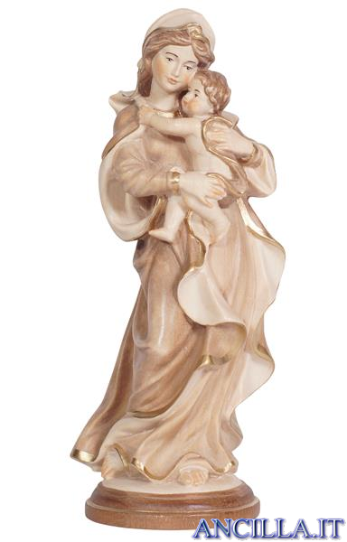 Statua in legno "Madonna Raffaello" brunita con tre diversi colori bruni e decorata con un filo dipinto in oro.