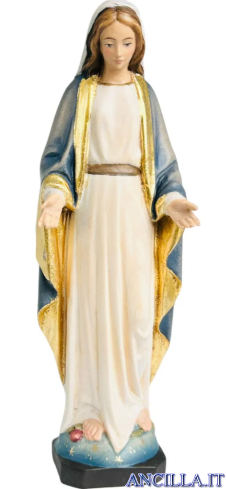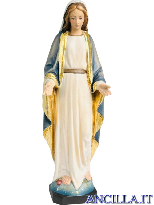 Statua "Maria Immacolata" realizzata in legno d'acero (o di tiglio per le misure superiori ai 40 cm) e dipinta con colori a olio tinte pastello.
