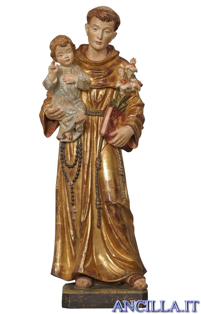 La statua di Sant'Antonio con Bambino è scolpita in legno d'acero o di tiglio (per le misure superiori ai 40 cm). In questa versione viene dato alla statua un effetto antico, accentuato ulteriormente dalla predominanza del colore oro nella pittura. La veste del santo, infatti, è interamente dipinta con l'oro zecchino.