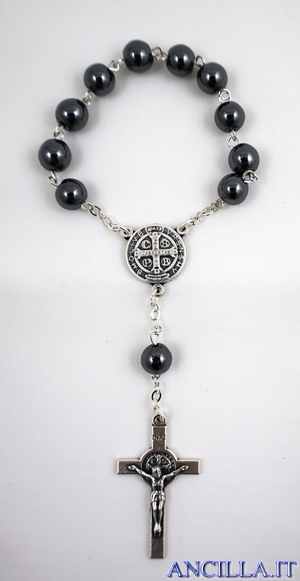 Undicina con grani in ematite da 8 mm, con Croce e medaglia di San Benedetto.